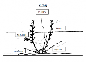 Когда ростки достигнут длины 15-20 сантиметра, оставляем 2 наиболее сильных и удачно размещенных в плоскости ряда. Другие удаляем. По мере роста ростки подвязываем к проволоке шпалеры. Если за исключением оставленных побегов начинает расти поросль, “двойники” -удаляем. Пасынки прищипываем над 2-м листом, способствуя развитию лишь 2-х главных побегов. В авг. – чеканка верхушки побегов. В осеннее время обрезаем лозы на 2-3 глазка, кустарник укрываем. Читать полностью »
