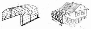 Беседки могут быть разной формы – круглые, овальные, четырехугольные с разнообразным перекрытием – плоским, конусовидным, пирамидальным; галереи – прямые, полукруглые, с полуобхватом дачного домика. Вдоль заборов возможно устроить высокие шпалеры (рис. 1).